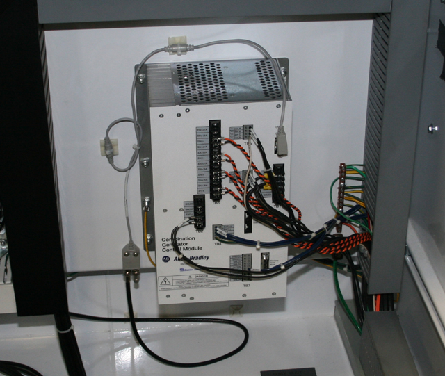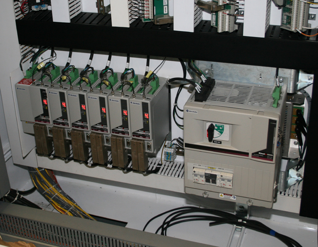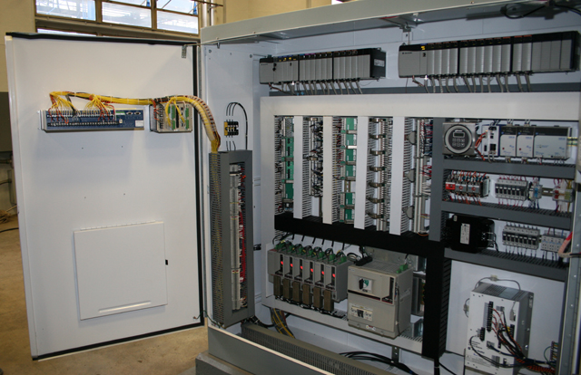 Allen Bradley ControlLogix PLC and Kinetix 6000 Servo. Allen Bradley 1492 Wiring Systems was used for I/O connections. "Industrial Automation Wiring and Grounding Guidelines" was followed to minimize any noise issues (duct coloring indicates signal level classification).